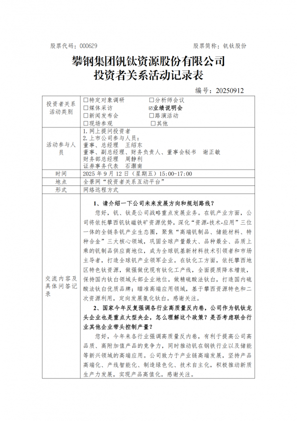 在业绩说明会上,投资者关注到公司未来发展方向与规划。公司表示,钒、钛是公司战略重点发展业务。在钒产业方面,公司将依托攀西钒钛磁铁矿资源优势,深化“资源-技术-应用”三位一体的全链条钒产业生态圈,聚焦“高端钒制品、储能材料、特种合金”三大核心领域,巩固全球产量最大、品种最全、品质上乘的钒制品供应商地位,成为全球钒基新材料技术引领者和市场主导者,打造全球钒产业领军企业。在钛化工方面,依托攀西地区特色钛资源,做强做优现有钛化工产线,全面提质降本增效,保持国内钛白领域头部企业地位。做精硫酸法钛白,打造国内硫酸法钛白优质品牌;瞄准高端应用领域,基于攀西资源特色和二次资源利用,定向发展氯化钛白。