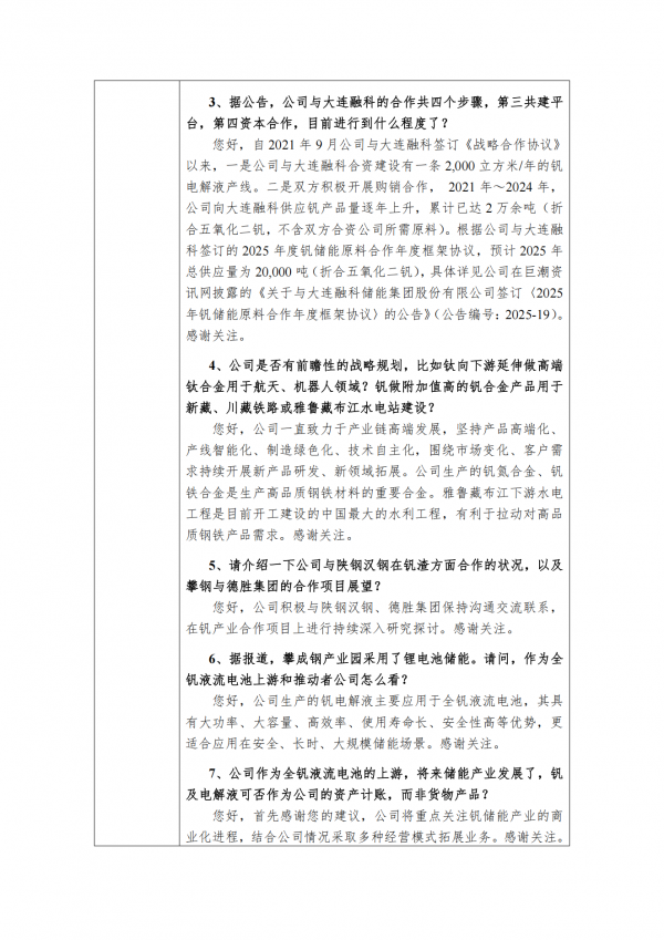 自2021年9月公司与大连融科签订《战略合作协议》后,双方合作成果显著。一是合资建设一条2,000立方米/年的钒电解液产线;二是购销合作积极,2021 - 2024年公司向大连融科供应钒产品量逐年上升,累计已达2万余吨(折合五氧化二钒,不含合资公司所需原料)。根据公司与大连融科签订的2025年度钒储能原料合作年度框架协议,预计2025年总供应量为20,000吨(折合五氧化二钒)。