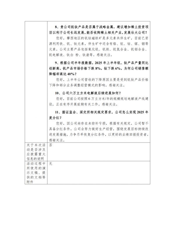 关于公司财务数据,2025年上半年钒、钛产品产量同比创新高,但钒产品市场价格下跌8%,钛下跌6%,公司销售额降幅高达40%,主要受钒钛产品价格下降和部分业务调整经营模式影响。在电解液项目上,公司按照6万立方米/年规模规划电解液产线建设,目前正有序开展前期工作。分红方面,因公司尚存在未弥补亏损,暂不具备分红条件,公司将努力做好经营争取尽早恢复分红。