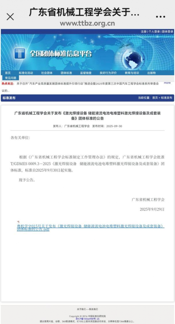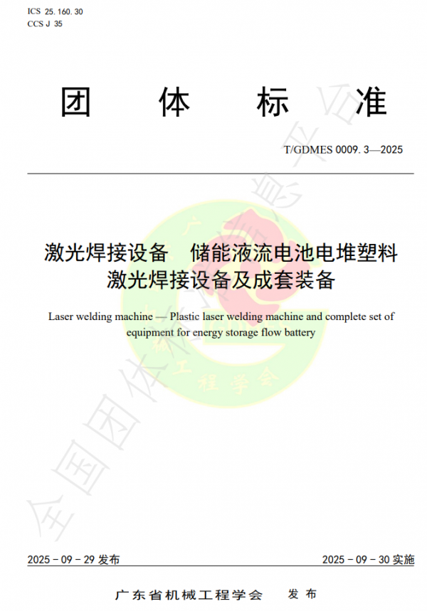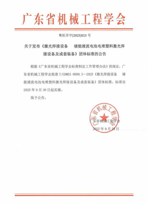 据全球液流电池网获悉,2025年9月30日,经广东省机械工程学会标准化工作委员会确定,由广东华焯激光科技有限公司牵头,联合山西国润储能科技有限公司、中南大学、中国电器科学研究院股份有限公司、广东省机械工程学会等多家单位共同制定的团体标准《激光焊接设备 储能液流电池电堆塑料激光焊接设备及成套装备》正式发布。这一标准的出台,将为储能液流电池电堆塑料激光焊接设备及成套装备领域提供全面、科学、可操作的规范指引,推动行业向更高质量、更规范化的方向发展。