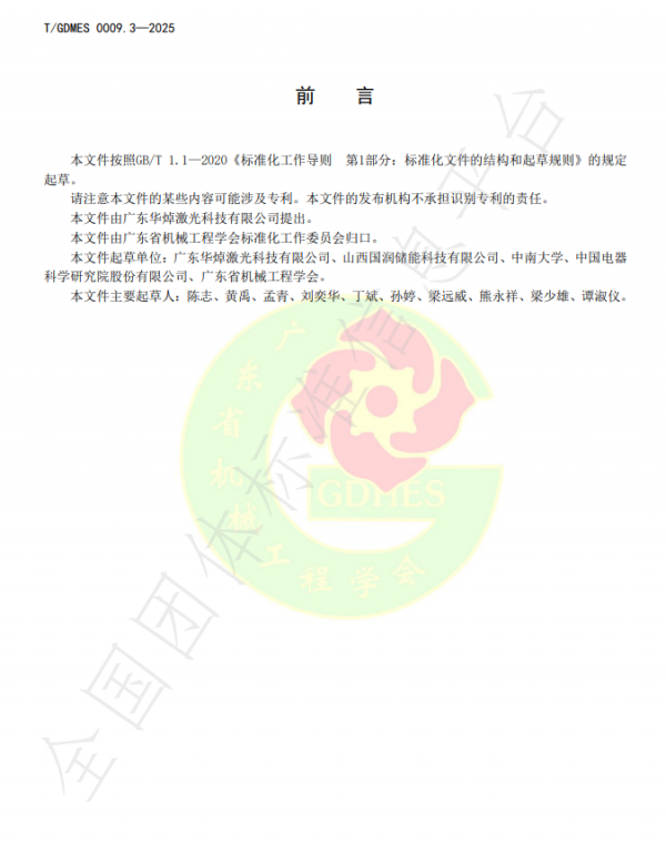 本标准起草组由中南大学陈志副教授、广东华焯激光科技有限公司技术带头人及总工程师黄禹教授、丁斌总经理及工程师梁远威、熊永祥、梁少雄、谭淑仪、山西国润储能科技有限公司孟青博士、广东省机械工程学会刘奕华教授级高工、以及中国电器科学研究院股份有限公司孙婷等人员组成。其中,陈志副教授、黄禹教授负责项目的组织和整体规划,以及标准起草和格式修改工作,他们凭借丰富的行业经验和专业知识,为标准制定指明了方向;丁斌、梁远威负责样品收集、标准验证试验相关工作,通过大量的实验和数据分析,确保标准的技术指标具有可靠性和可操作性。